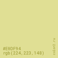 Цвет #E0DF94 в цветовой модели RGB обозначается тремя октетами (224, 223, 148) в десятичном формате и #E0DF94 в шестнадцатиричном (hex) формате, которые являются интенсивностью красного 224 (hex E0), интенсивность зелёного 223 (hex DF) и интенсивность синего 148 (hex 94).