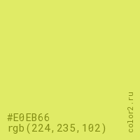 Цвет #E0EB66 в цветовой модели RGB обозначается тремя октетами (224, 235, 102) в десятичном формате и #E0EB66 в шестнадцатиричном (hex) формате, которые являются интенсивностью красного 224 (hex E0), интенсивность зелёного 235 (hex EB) и интенсивность синего 102 (hex 66).