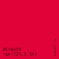 Цвет #E10338 в цветовой модели RGB обозначается тремя октетами (225, 3, 56) в десятичном формате и #E10338 в шестнадцатиричном (hex) формате, которые являются интенсивностью красного 225 (hex E1), интенсивность зелёного 3 (hex 03) и интенсивность синего 56 (hex 38).