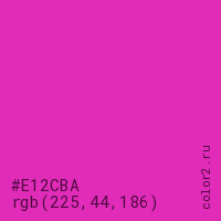 Цвет #E12CBA в цветовой модели RGB обозначается тремя октетами (225, 44, 186) в десятичном формате и #E12CBA в шестнадцатиричном (hex) формате, которые являются интенсивностью красного 225 (hex E1), интенсивность зелёного 44 (hex 2C) и интенсивность синего 186 (hex BA).