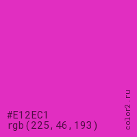 Цвет #E12EC1 в цветовой модели RGB обозначается тремя октетами (225, 46, 193) в десятичном формате и #E12EC1 в шестнадцатиричном (hex) формате, которые являются интенсивностью красного 225 (hex E1), интенсивность зелёного 46 (hex 2E) и интенсивность синего 193 (hex C1).