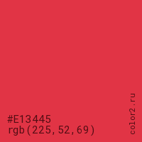 Цвет #E13445 в цветовой модели RGB обозначается тремя октетами (225, 52, 69) в десятичном формате и #E13445 в шестнадцатиричном (hex) формате, которые являются интенсивностью красного 225 (hex E1), интенсивность зелёного 52 (hex 34) и интенсивность синего 69 (hex 45).