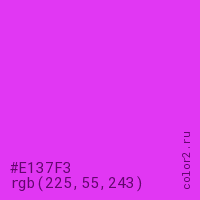 Цвет #E137F3 в цветовой модели RGB обозначается тремя октетами (225, 55, 243) в десятичном формате и #E137F3 в шестнадцатиричном (hex) формате, которые являются интенсивностью красного 225 (hex E1), интенсивность зелёного 55 (hex 37) и интенсивность синего 243 (hex F3).