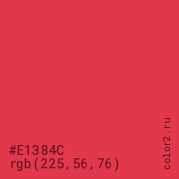 Цвет #E1384C в цветовой модели RGB обозначается тремя октетами (225, 56, 76) в десятичном формате и #E1384C в шестнадцатиричном (hex) формате, которые являются интенсивностью красного 225 (hex E1), интенсивность зелёного 56 (hex 38) и интенсивность синего 76 (hex 4C).