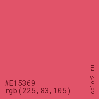 Цвет #E15369 в цветовой модели RGB обозначается тремя октетами (225, 83, 105) в десятичном формате и #E15369 в шестнадцатиричном (hex) формате, которые являются интенсивностью красного 225 (hex E1), интенсивность зелёного 83 (hex 53) и интенсивность синего 105 (hex 69).