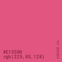 Цвет #E15580 в цветовой модели RGB обозначается тремя октетами (225, 85, 128) в десятичном формате и #E15580 в шестнадцатиричном (hex) формате, которые являются интенсивностью красного 225 (hex E1), интенсивность зелёного 85 (hex 55) и интенсивность синего 128 (hex 80).