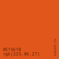 Цвет #E1561B в цветовой модели RGB обозначается тремя октетами (225, 86, 27) в десятичном формате и #E1561B в шестнадцатиричном (hex) формате, которые являются интенсивностью красного 225 (hex E1), интенсивность зелёного 86 (hex 56) и интенсивность синего 27 (hex 1B).