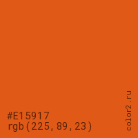 Цвет #E15917 в цветовой модели RGB обозначается тремя октетами (225, 89, 23) в десятичном формате и #E15917 в шестнадцатиричном (hex) формате, которые являются интенсивностью красного 225 (hex E1), интенсивность зелёного 89 (hex 59) и интенсивность синего 23 (hex 17).