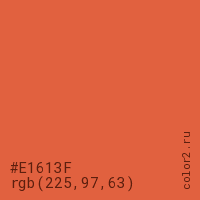 Цвет #E1613F в цветовой модели RGB обозначается тремя октетами (225, 97, 63) в десятичном формате и #E1613F в шестнадцатиричном (hex) формате, которые являются интенсивностью красного 225 (hex E1), интенсивность зелёного 97 (hex 61) и интенсивность синего 63 (hex 3F).