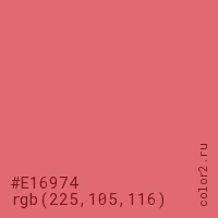 Цвет #E16974 в цветовой модели RGB обозначается тремя октетами (225, 105, 116) в десятичном формате и #E16974 в шестнадцатиричном (hex) формате, которые являются интенсивностью красного 225 (hex E1), интенсивность зелёного 105 (hex 69) и интенсивность синего 116 (hex 74).