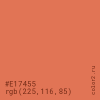 Цвет #E17455 в цветовой модели RGB обозначается тремя октетами (225, 116, 85) в десятичном формате и #E17455 в шестнадцатиричном (hex) формате, которые являются интенсивностью красного 225 (hex E1), интенсивность зелёного 116 (hex 74) и интенсивность синего 85 (hex 55).