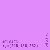 Цвет #E18AFC в цветовой модели RGB обозначается тремя октетами (225, 138, 252) в десятичном формате и #E18AFC в шестнадцатиричном (hex) формате, которые являются интенсивностью красного 225 (hex E1), интенсивность зелёного 138 (hex 8A) и интенсивность синего 252 (hex FC).