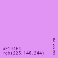 Цвет #E194F4 в цветовой модели RGB обозначается тремя октетами (225, 148, 244) в десятичном формате и #E194F4 в шестнадцатиричном (hex) формате, которые являются интенсивностью красного 225 (hex E1), интенсивность зелёного 148 (hex 94) и интенсивность синего 244 (hex F4).