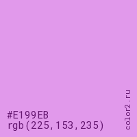Цвет #E199EB в цветовой модели RGB обозначается тремя октетами (225, 153, 235) в десятичном формате и #E199EB в шестнадцатиричном (hex) формате, которые являются интенсивностью красного 225 (hex E1), интенсивность зелёного 153 (hex 99) и интенсивность синего 235 (hex EB).