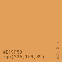 Цвет #E19F59 в цветовой модели RGB обозначается тремя октетами (225, 159, 89) в десятичном формате и #E19F59 в шестнадцатиричном (hex) формате, которые являются интенсивностью красного 225 (hex E1), интенсивность зелёного 159 (hex 9F) и интенсивность синего 89 (hex 59).