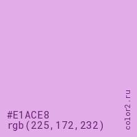 Цвет #E1ACE8 в цветовой модели RGB обозначается тремя октетами (225, 172, 232) в десятичном формате и #E1ACE8 в шестнадцатиричном (hex) формате, которые являются интенсивностью красного 225 (hex E1), интенсивность зелёного 172 (hex AC) и интенсивность синего 232 (hex E8).