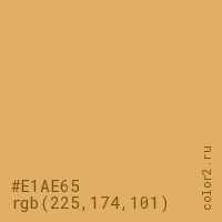 Цвет #E1AE65 в цветовой модели RGB обозначается тремя октетами (225, 174, 101) в десятичном формате и #E1AE65 в шестнадцатиричном (hex) формате, которые являются интенсивностью красного 225 (hex E1), интенсивность зелёного 174 (hex AE) и интенсивность синего 101 (hex 65).