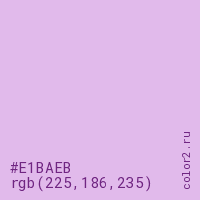 Цвет #E1BAEB в цветовой модели RGB обозначается тремя октетами (225, 186, 235) в десятичном формате и #E1BAEB в шестнадцатиричном (hex) формате, которые являются интенсивностью красного 225 (hex E1), интенсивность зелёного 186 (hex BA) и интенсивность синего 235 (hex EB).