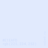 Цвет #E1EAFD в цветовой модели RGB обозначается тремя октетами (225, 234, 253) в десятичном формате и #E1EAFD в шестнадцатиричном (hex) формате, которые являются интенсивностью красного 225 (hex E1), интенсивность зелёного 234 (hex EA) и интенсивность синего 253 (hex FD).