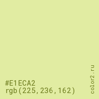 Цвет #E1ECA2 в цветовой модели RGB обозначается тремя октетами (225, 236, 162) в десятичном формате и #E1ECA2 в шестнадцатиричном (hex) формате, которые являются интенсивностью красного 225 (hex E1), интенсивность зелёного 236 (hex EC) и интенсивность синего 162 (hex A2).