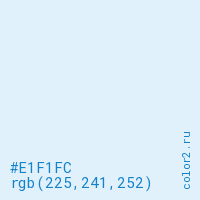 Цвет #E1F1FC в цветовой модели RGB обозначается тремя октетами (225, 241, 252) в десятичном формате и #E1F1FC в шестнадцатиричном (hex) формате, которые являются интенсивностью красного 225 (hex E1), интенсивность зелёного 241 (hex F1) и интенсивность синего 252 (hex FC).