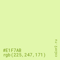 Цвет #E1F7AB в цветовой модели RGB обозначается тремя октетами (225, 247, 171) в десятичном формате и #E1F7AB в шестнадцатиричном (hex) формате, которые являются интенсивностью красного 225 (hex E1), интенсивность зелёного 247 (hex F7) и интенсивность синего 171 (hex AB).