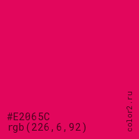 Цвет #E2065C в цветовой модели RGB обозначается тремя октетами (226, 6, 92) в десятичном формате и #E2065C в шестнадцатиричном (hex) формате, которые являются интенсивностью красного 226 (hex E2), интенсивность зелёного 6 (hex 06) и интенсивность синего 92 (hex 5C).
