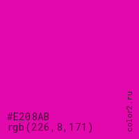 Цвет #E208AB в цветовой модели RGB обозначается тремя октетами (226, 8, 171) в десятичном формате и #E208AB в шестнадцатиричном (hex) формате, которые являются интенсивностью красного 226 (hex E2), интенсивность зелёного 8 (hex 08) и интенсивность синего 171 (hex AB).