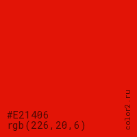 Цвет #E21406 в цветовой модели RGB обозначается тремя октетами (226, 20, 6) в десятичном формате и #E21406 в шестнадцатиричном (hex) формате, которые являются интенсивностью красного 226 (hex E2), интенсивность зелёного 20 (hex 14) и интенсивность синего 6 (hex 06).