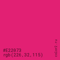Цвет #E22073 в цветовой модели RGB обозначается тремя октетами (226, 32, 115) в десятичном формате и #E22073 в шестнадцатиричном (hex) формате, которые являются интенсивностью красного 226 (hex E2), интенсивность зелёного 32 (hex 20) и интенсивность синего 115 (hex 73).