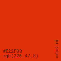 Цвет #E22F08 в цветовой модели RGB обозначается тремя октетами (226, 47, 8) в десятичном формате и #E22F08 в шестнадцатиричном (hex) формате, которые являются интенсивностью красного 226 (hex E2), интенсивность зелёного 47 (hex 2F) и интенсивность синего 8 (hex 08).
