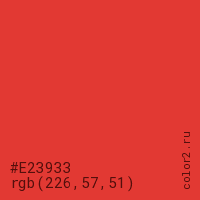 Цвет #E23933 в цветовой модели RGB обозначается тремя октетами (226, 57, 51) в десятичном формате и #E23933 в шестнадцатиричном (hex) формате, которые являются интенсивностью красного 226 (hex E2), интенсивность зелёного 57 (hex 39) и интенсивность синего 51 (hex 33).