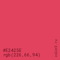 Цвет #E2425E в цветовой модели RGB обозначается тремя октетами (226, 66, 94) в десятичном формате и #E2425E в шестнадцатиричном (hex) формате, которые являются интенсивностью красного 226 (hex E2), интенсивность зелёного 66 (hex 42) и интенсивность синего 94 (hex 5E).