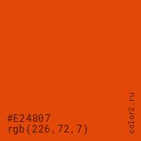 Цвет #E24807 в цветовой модели RGB обозначается тремя октетами (226, 72, 7) в десятичном формате и #E24807 в шестнадцатиричном (hex) формате, которые являются интенсивностью красного 226 (hex E2), интенсивность зелёного 72 (hex 48) и интенсивность синего 7 (hex 07).