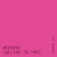Цвет #E24993 в цветовой модели RGB обозначается тремя октетами (226, 73, 147) в десятичном формате и #E24993 в шестнадцатиричном (hex) формате, которые являются интенсивностью красного 226 (hex E2), интенсивность зелёного 73 (hex 49) и интенсивность синего 147 (hex 93).