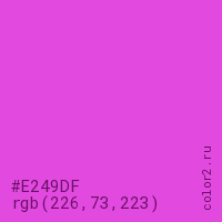 Цвет #E249DF в цветовой модели RGB обозначается тремя октетами (226, 73, 223) в десятичном формате и #E249DF в шестнадцатиричном (hex) формате, которые являются интенсивностью красного 226 (hex E2), интенсивность зелёного 73 (hex 49) и интенсивность синего 223 (hex DF).