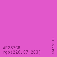 Цвет #E257CB в цветовой модели RGB обозначается тремя октетами (226, 87, 203) в десятичном формате и #E257CB в шестнадцатиричном (hex) формате, которые являются интенсивностью красного 226 (hex E2), интенсивность зелёного 87 (hex 57) и интенсивность синего 203 (hex CB).