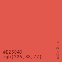 Цвет #E2584D в цветовой модели RGB обозначается тремя октетами (226, 88, 77) в десятичном формате и #E2584D в шестнадцатиричном (hex) формате, которые являются интенсивностью красного 226 (hex E2), интенсивность зелёного 88 (hex 58) и интенсивность синего 77 (hex 4D).