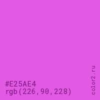 Цвет #E25AE4 в цветовой модели RGB обозначается тремя октетами (226, 90, 228) в десятичном формате и #E25AE4 в шестнадцатиричном (hex) формате, которые являются интенсивностью красного 226 (hex E2), интенсивность зелёного 90 (hex 5A) и интенсивность синего 228 (hex E4).