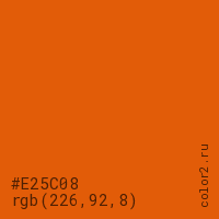 Цвет #E25C08 в цветовой модели RGB обозначается тремя октетами (226, 92, 8) в десятичном формате и #E25C08 в шестнадцатиричном (hex) формате, которые являются интенсивностью красного 226 (hex E2), интенсивность зелёного 92 (hex 5C) и интенсивность синего 8 (hex 08).