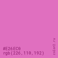 Цвет #E26EC0 в цветовой модели RGB обозначается тремя октетами (226, 110, 192) в десятичном формате и #E26EC0 в шестнадцатиричном (hex) формате, которые являются интенсивностью красного 226 (hex E2), интенсивность зелёного 110 (hex 6E) и интенсивность синего 192 (hex C0).