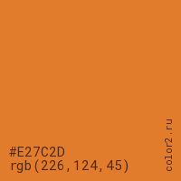 Цвет #E27C2D в цветовой модели RGB обозначается тремя октетами (226, 124, 45) в десятичном формате и #E27C2D в шестнадцатиричном (hex) формате, которые являются интенсивностью красного 226 (hex E2), интенсивность зелёного 124 (hex 7C) и интенсивность синего 45 (hex 2D).