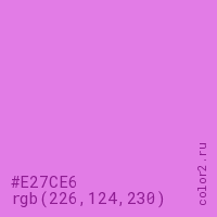 Цвет #E27CE6 в цветовой модели RGB обозначается тремя октетами (226, 124, 230) в десятичном формате и #E27CE6 в шестнадцатиричном (hex) формате, которые являются интенсивностью красного 226 (hex E2), интенсивность зелёного 124 (hex 7C) и интенсивность синего 230 (hex E6).