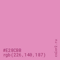 Цвет #E28CBB в цветовой модели RGB обозначается тремя октетами (226, 140, 187) в десятичном формате и #E28CBB в шестнадцатиричном (hex) формате, которые являются интенсивностью красного 226 (hex E2), интенсивность зелёного 140 (hex 8C) и интенсивность синего 187 (hex BB).