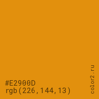 Цвет #E2900D в цветовой модели RGB обозначается тремя октетами (226, 144, 13) в десятичном формате и #E2900D в шестнадцатиричном (hex) формате, которые являются интенсивностью красного 226 (hex E2), интенсивность зелёного 144 (hex 90) и интенсивность синего 13 (hex 0D).