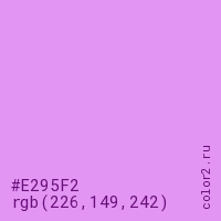 Цвет #E295F2 в цветовой модели RGB обозначается тремя октетами (226, 149, 242) в десятичном формате и #E295F2 в шестнадцатиричном (hex) формате, которые являются интенсивностью красного 226 (hex E2), интенсивность зелёного 149 (hex 95) и интенсивность синего 242 (hex F2).