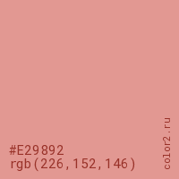 Цвет #E29892 в цветовой модели RGB обозначается тремя октетами (226, 152, 146) в десятичном формате и #E29892 в шестнадцатиричном (hex) формате, которые являются интенсивностью красного 226 (hex E2), интенсивность зелёного 152 (hex 98) и интенсивность синего 146 (hex 92).