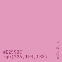 Цвет #E299BC в цветовой модели RGB обозначается тремя октетами (226, 153, 188) в десятичном формате и #E299BC в шестнадцатиричном (hex) формате, которые являются интенсивностью красного 226 (hex E2), интенсивность зелёного 153 (hex 99) и интенсивность синего 188 (hex BC).