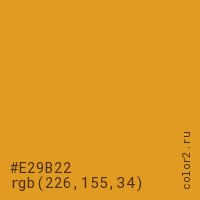 Цвет #E29B22 в цветовой модели RGB обозначается тремя октетами (226, 155, 34) в десятичном формате и #E29B22 в шестнадцатиричном (hex) формате, которые являются интенсивностью красного 226 (hex E2), интенсивность зелёного 155 (hex 9B) и интенсивность синего 34 (hex 22).