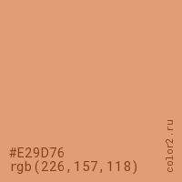 Цвет #E29D76 в цветовой модели RGB обозначается тремя октетами (226, 157, 118) в десятичном формате и #E29D76 в шестнадцатиричном (hex) формате, которые являются интенсивностью красного 226 (hex E2), интенсивность зелёного 157 (hex 9D) и интенсивность синего 118 (hex 76).